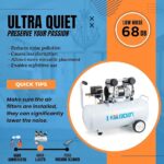 - ONLY 68 dB: The best air compressor for working in residential or commercial areas, our whisper quiet air compressor uses an induction motor with a low speed of only 3240 RPM provides smooth and quiet operation while delivering reliable compressed air supply, which means you can run inside the house, in a workshop, or on a jobsite without interrupting others.